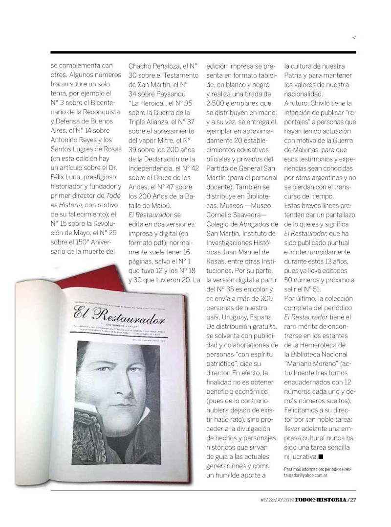 Publicado en el Periódico El Restaurador - Año XII N° 52 - Setiembre 2019 - Pags. 10 a 13